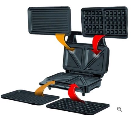 • It features 3-in-1 functionality with detachable plates for sandwiches, waffles, and grilling.