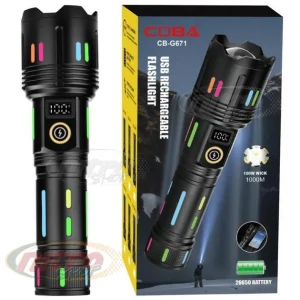 The COBA CB-G671 Digital Flashlight Torch is a high-performance lighting solution engineered for power, durability, and long-range visibility. Built with a premium aluminum alloy body, this flashlight is designed to withstand tough outdoor and professional use while maintaining a sleek, modern look.