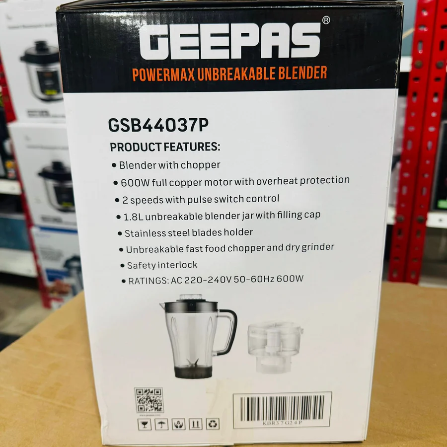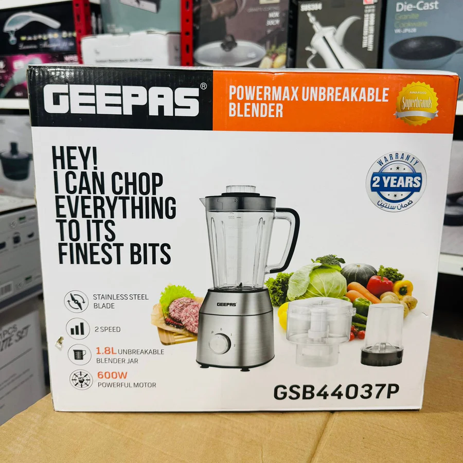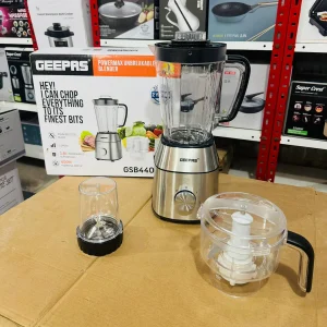 The Geepas Powermax GSB44037 3-in-1 Blender is a durable and versatile kitchen appliance designed for everyday use. Featuring an unbreakable jar and a powerful motor, it delivers smooth blending, efficient grinding, and quick juicing. Whether you’re making smoothies, grinding spices, or preparing fresh juices, this all-in-one blender ensures reliable performance and convenience in your kitchen.